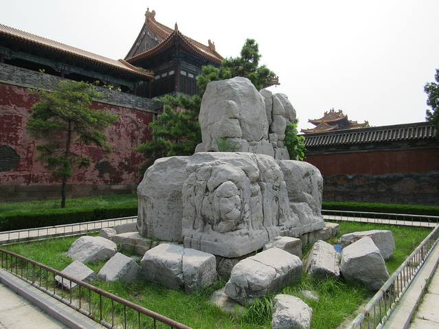一片狼藉,实在令人心痛。从地上的碎石块的体积可以想象原先整个石刻多么壮观。那个特殊的年代无数的古树、古碑就被这样毁了。它们有被用作建房盖舍,有的填充了道路,有的当作了花墙和房屋的墙基……,据华阴县华山公社王道大队一个老石匠谈,经他手凿毁的古碑就不下数十块。
