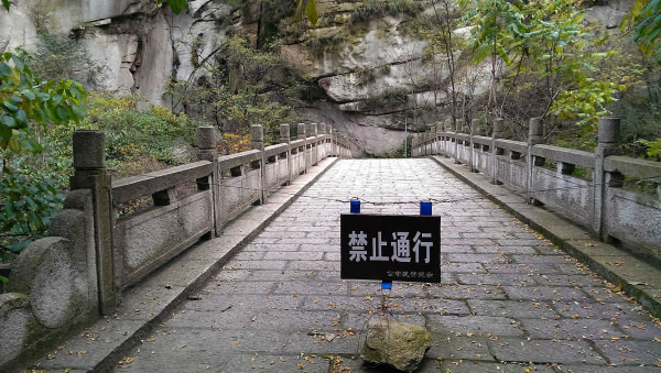过了这个桥就是了,桥头用铁丝拦住并有警示牌。(此图借用贴吧吧友的)他去的时候湿度应该很大,看下面我拍的有明显对比。