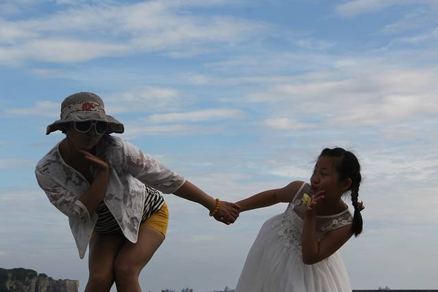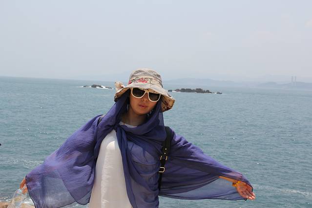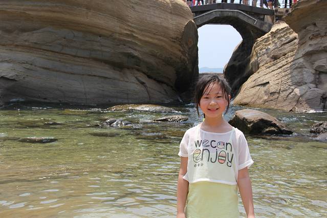 "船帆石"形状似一艘进港的船只,石头上长满了野草花卉与灌木,成为鸟群栖息的窝巢。配合旁边湛蓝的海水,构成了一幅绝美的风景画。我在这儿给女儿拍摄的几组照片同样堪称经典!