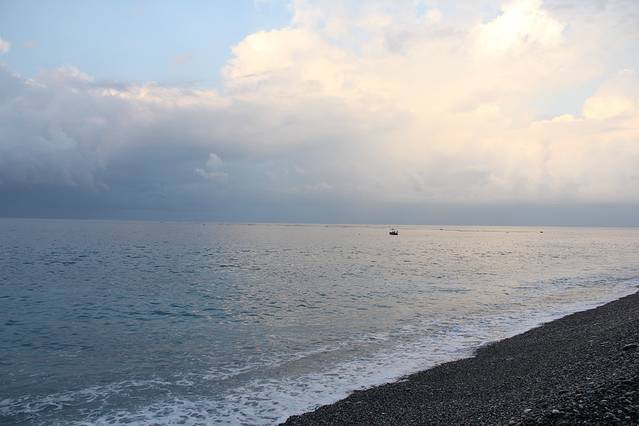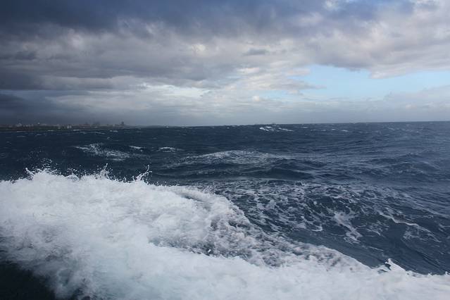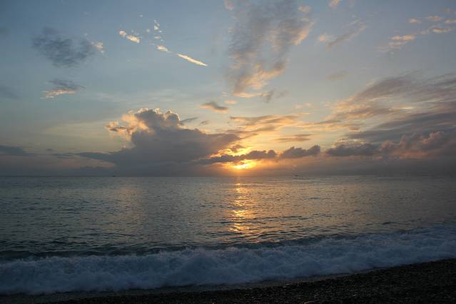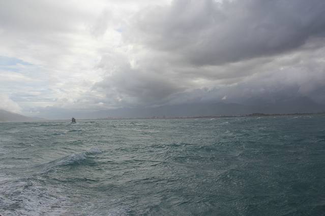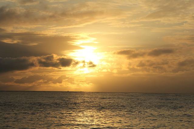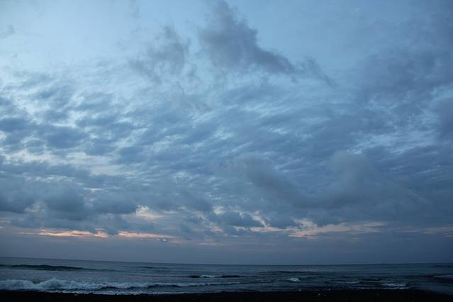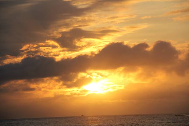 天逐渐亮起来了,不过云层还是很厚,看来我还是无缘看到完美的海上日出了。时间在一分一秒的过去,阳光渐渐的越来越明亮了,云层的颜色也跟着发生了变化,刚开始是深深的褐色,然后变成蓝色,而海面也同样的变化着,偶尔强烈的阳光突然透出云层反射在海面,在这蓝色的海水之上镀上了一层金黄。