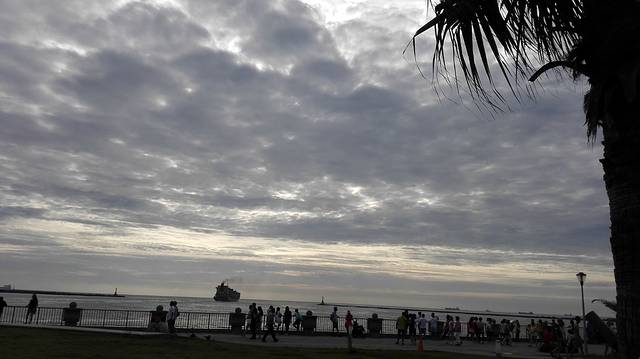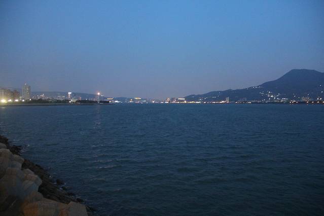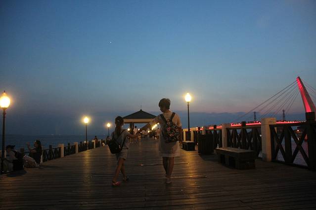不过,在中山大学校园旁边的海滨步道上,我们度过了一个美妙的黄昏!这里,蓝天白云,尤其是白云,不是简单的挂在天上,这里的云是立体的,是有层次的,仅仅用眼睛盯着看,我就深深的沉醉其中;这里碧波荡漾,海水洁净湛蓝,远处的海面上船帆点点,对面的旗津岛宁静深邃。配合夕阳的余晖、稀疏的人影,美不胜收!相机随便一拍,都是震撼人心,都完全可以作为电脑手机的桌面屏保。