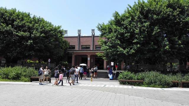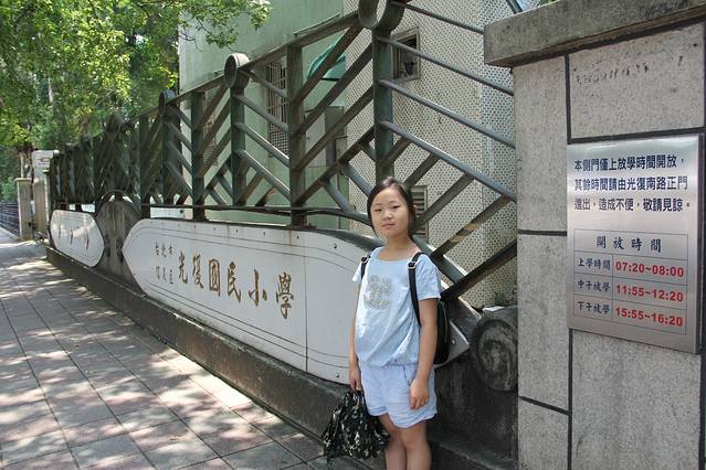 国父纪念馆门前的光复国民小学,小学生在小学校门前留影