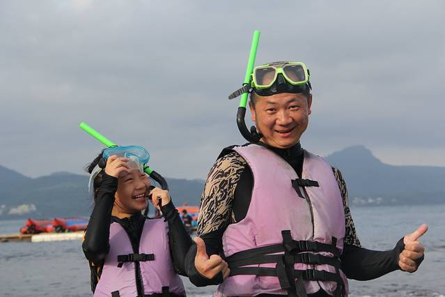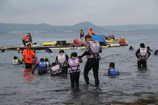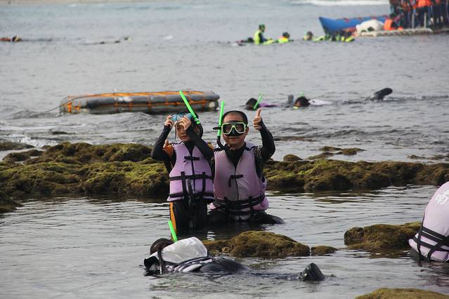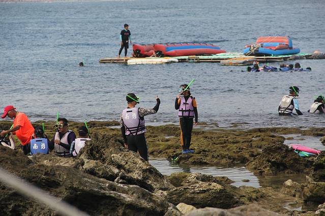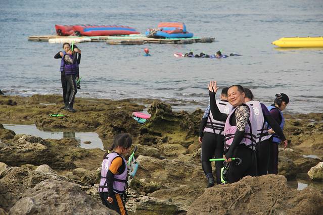 南湾是垦丁的潜水胜地,适合各种潜水,有船潜、岸潜、浮潜等等,来到垦丁的游客大多都要来此体验一把。和我们之前在马来西亚玩的免费浮潜不同,这里的浮潜是要收费的,每人350台币,但包括来回的汽车接送、教练培训、潜水用具、潜水服装、冲凉等等,价格比较公道。