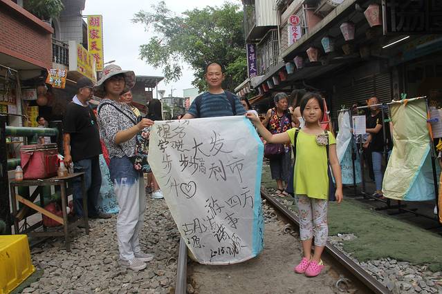 十分车站是平溪线的另一个标志性景点,首先源于它的名字好听,随便连上一个吉祥的词语就会变成一个美丽的祝愿,车站旁的邮局挂满了各类明信片“十分幸福”、“十分美好”等等;其次十分老街、静安吊桥等景点那种复古怀旧的感觉,也成了许多游客驻足取景留影好地方;最后,有赖于台湾电影《那些年我们一起追过的女孩》故事中最浪漫的一刻取景于十分车站,所以十分车站就成为了台湾出名的放天灯许愿之地。此外,还有十分瀑布可以看看,我们专门200台币租了个电动车上去看了看,不过觉得景致一般。
