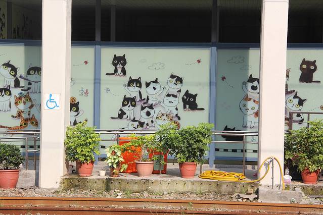 从十分出发车行两站,来到了猴硐车站。这里是一个喵星人的世界,猫咪们成了这个小村庄的主人,或慵懒、或警惕、或温柔、或刚毅,各色“人”等,不一而足。这里还有各种有趣的标语,宣誓着猫咪们的主权。平时,我就是一个特别喜欢猫的人,来到这里,忍不住多停留了一些时间。此外,我还教会了女儿如何同猫咪打招呼,如何判断猫咪们的喜怒哀乐,她真学会了不少呢。