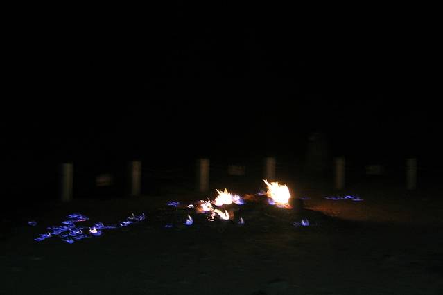 这个地方有点儿意思,地面上的蓝色火苗终年不灭,其成因是地底的天然气沿著岩层的裂隙冒出地面,点火后燃烧所形成。由于天然气蕴藏量太小,没有开采价值,也就任其燃烧了。
