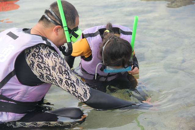 女儿怕水却又喜欢玩水,真的是一件很矛盾的事,在浅滩上接受教练培训的时候死活不敢把头埋进水里,甚至还被我训斥的流下了委屈的眼泪,好在教练很有经验,循循善诱,在我的鼓励下,女儿终于鼓起勇气潜入了大海,惊喜的告诉我看到了好多漂亮的小鱼!