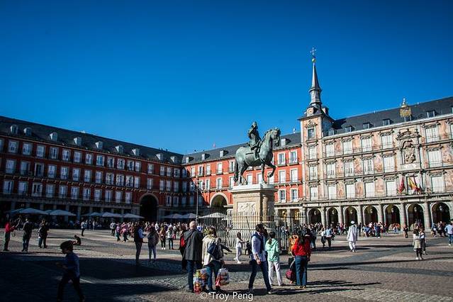 马约尔广场有着独特风格的四方形广场,广场中央是菲里普三世的骑马雕像。在建成之后的漫长岁月里经历了3次火灾,又重新修建,直至1953年完成后形成现在我们所看到的样子。以前在周围住户的阳台上经常可以看到奢华的皇家仪式、斗牛以及种种纪念活动,甚至是宗教裁判所施行的火刑现场的这座广场上,现在回荡的是抱着廉价吉他的年轻人们的嘹亮歌声。