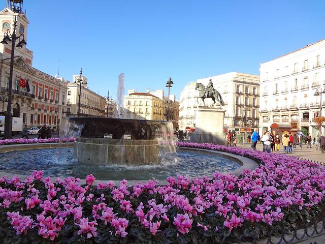 太阳门广场在马德里的正中心位置,是一个半圆形的广场,从那里有10条街道呈放射状向外延伸。其名称缘于这里原有一扇朝东方开的称为太阳门的大门,现在此门已不存在。现在太阳门广场是马德里孩子们游玩的场所,四周是马德里最繁华的商业区,所以永远人声鼎沸,喧闹非凡。