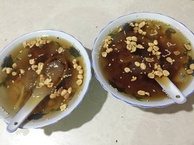 冰粉--有一股淡淡的玫瑰的清香,因为加有冰块吃起来特别凉爽,冰粉入口特别细腻光滑,值得来一碗解腻。