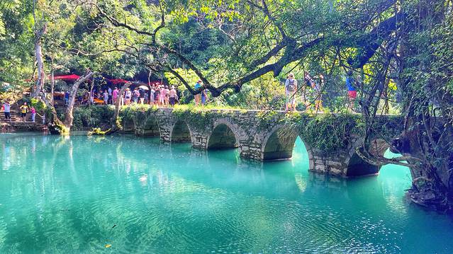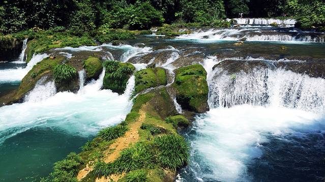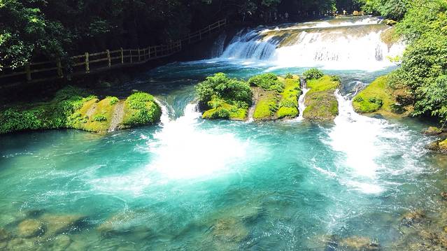 进入天星桥景区之后,满眼都是绿色,凉爽极了。盆景园里水与石相应成景,沿路道路狭窄,通过水上的石阶向前迈进。由于道路狭窄,加上游客众多,所以造成道路堵塞影响了游玩的兴致,所以我们就放弃前行,直奔大瀑布。