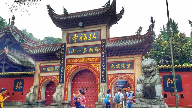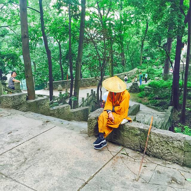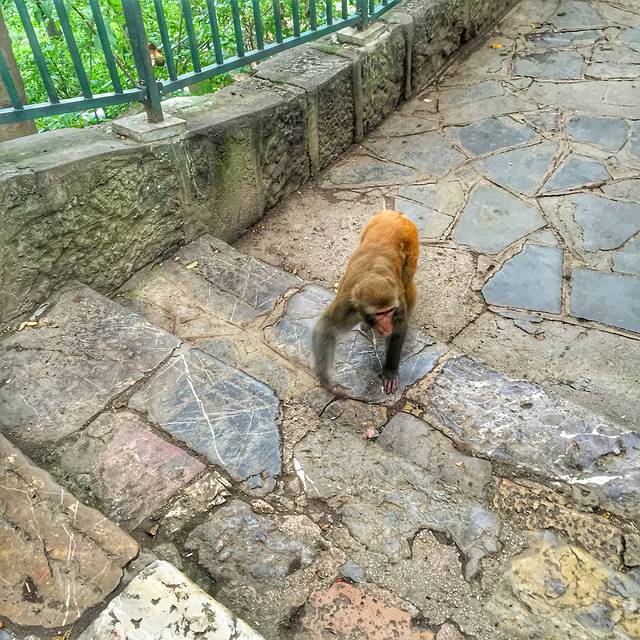 弘福寺就位于黔灵山公园内,得爬一段山路才能上到寺庙。一路上有各种可以供人烧香的佛祖,在快到寺庙门口的时候,有两只猕猴在护栏上嬉戏打闹,看见我们驻足拍照,就立马跑了过来,还会抢游客手中的食物。坐在一旁的和尚抽着烟翘着腿,神态特别的悠闲。