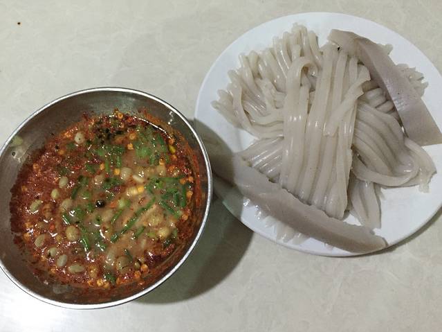 荞凉粉--粉特别细腻特别容易断,将粉放入调料中拌着吃。调料中有加入特别的味道,吃起来怪怪的,吃了一口就因为吃不惯而放弃了。