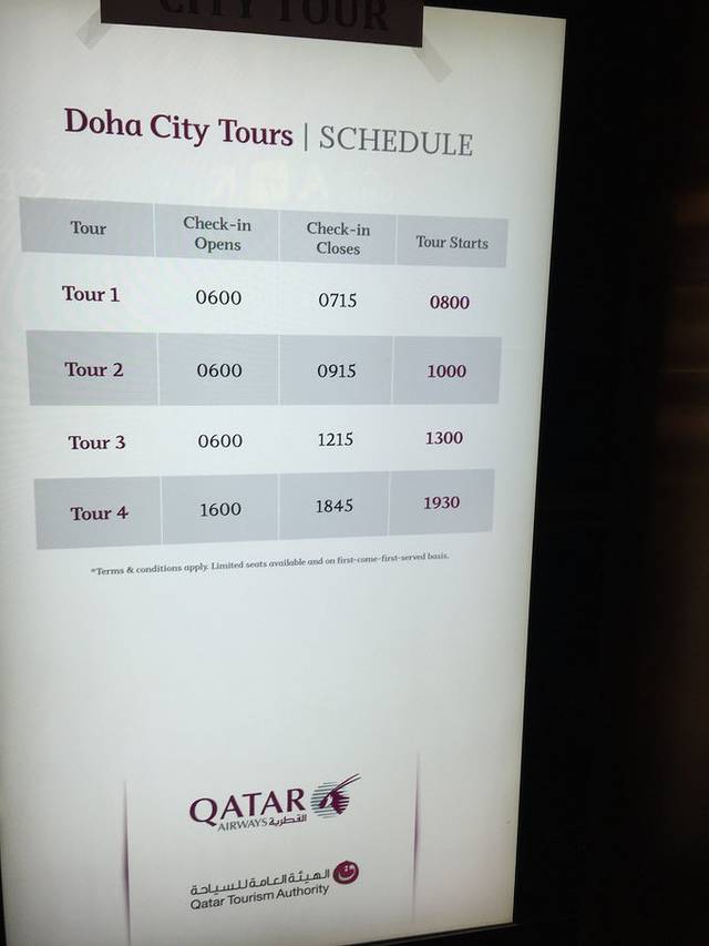 我回程的航班是17:30左右到达机场的,由于16:00就开放注册,怕可能已经团满了,于是下飞机后一看这个时间段转机的人流很少(清晨从上海飞去多哈时候转机人流明显多很多),但还是想去卡航的Transfer专柜试试是不是可以领meal voucher(后来其实旅行回来太饿,半夜在机场吃了份蛋炒饭和甜酸鸡=鸡块也是油炸的=,花了13美元),但是结果排队人太多,就不想等了,走到旅游登记柜台是18:52,结果发现我还是前5个报名今天最后一个tour的,工作人员愉快地登记了我的信息后,让我18:30集合在柜台一起过immigration。