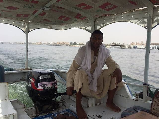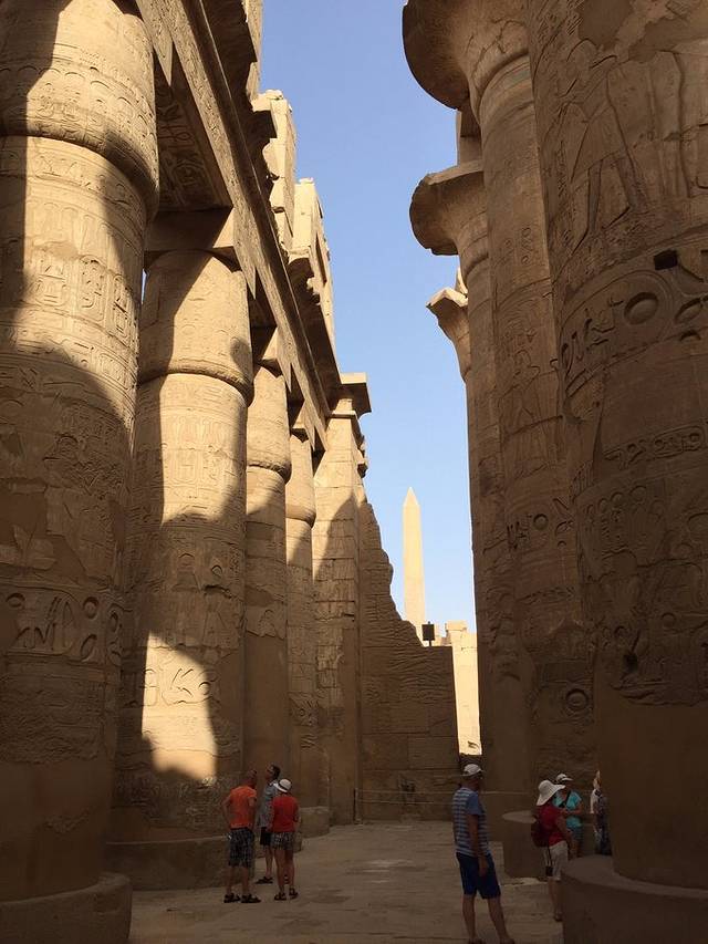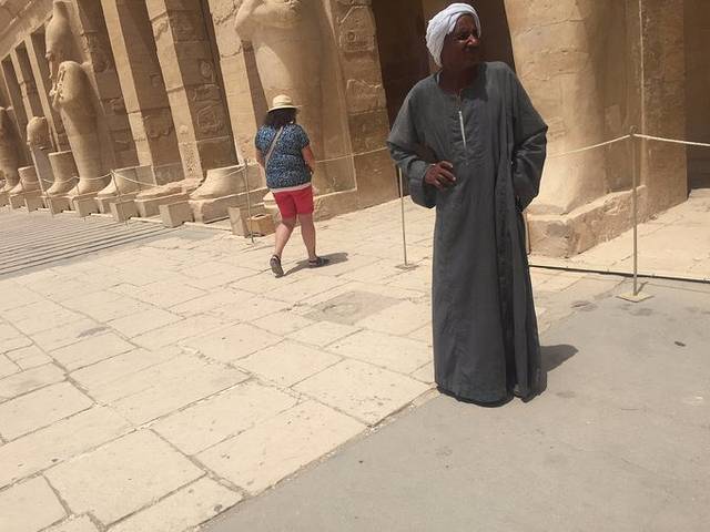 乘坐埃及航空MS160 8:25-9:25开罗-卢克索航班到达卢克索机场和导游接头,在卢克索玩的两天都是42-44度,确实是非常热啊!我被导游带到住处,一个五星plus的邮轮上过夜(我当的前天邮轮上住的是一个上海的旅行团,那天晚上邮轮停靠卢克索不动),名字是M/S Princess SARAH,住处和餐厅都很赞。听说船顶上都游泳池,但是一走上船顶,有一种人就会化了的感觉,本来想去一游,但看着这太阳,我就回房间去睡了一会儿(是不是因为起床太早,还是天气太热……)。由于天气太热,导游说计划改到下午3:00行动,去看了卢克索神庙,在那边还跟一个会西班牙语的导游胡侃了一通(我自己的导游有点小无聊的说,还有一句口头禅是you see there - lots of details, but over the years, the sun and the rain deleted all the details,特别喜欢用delete这个词,还明明带我一个人的团,喜欢叫我My friends,感觉自己自带分身功能,哆啦A梦化了),记得哦:要定时补充水分。后来还发现一个区别当地人和游客的方法:埃及人非常耐热,我的导游和司机都可以半天(真的是半天,4小时以上)滴水不喝,我有一个大瓶的水,问他要不要喝一口,人家很坚决的说不要,当你已经快被晒干的时候,埃及人还表示:这个天气正常……