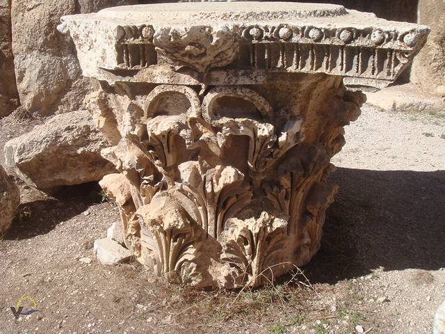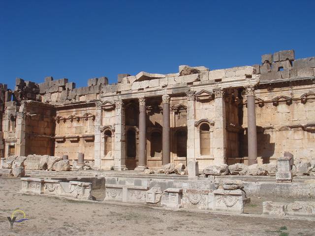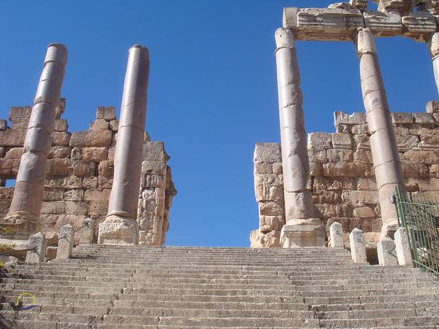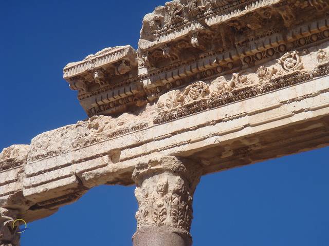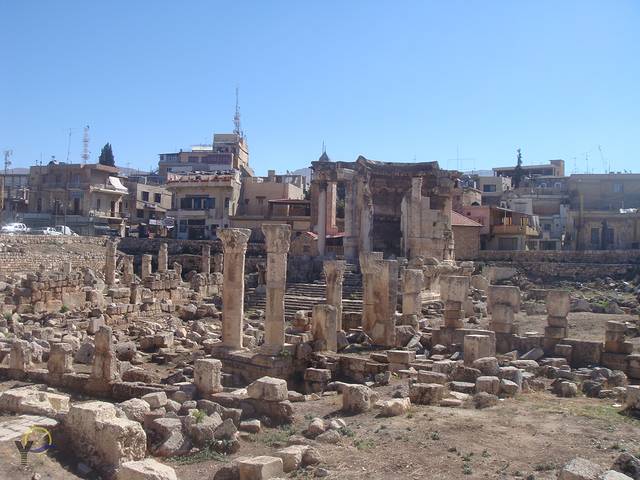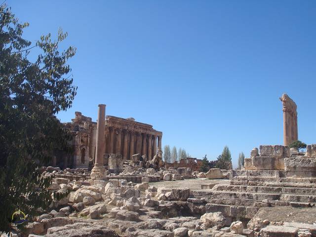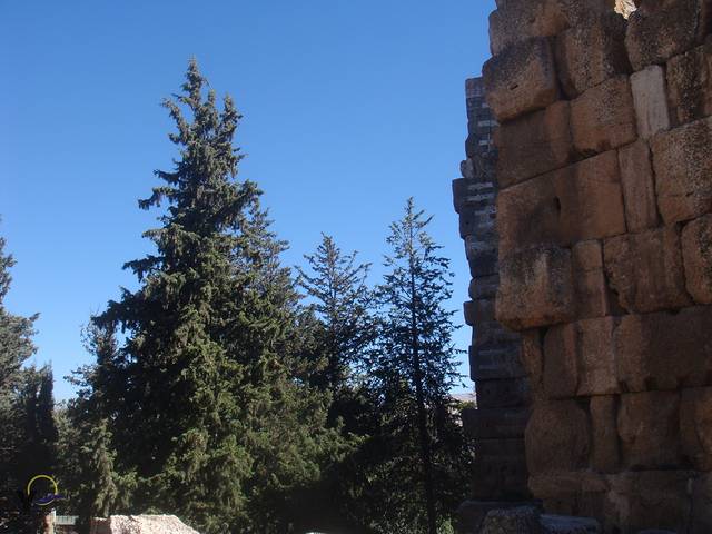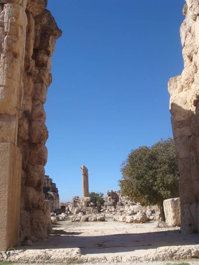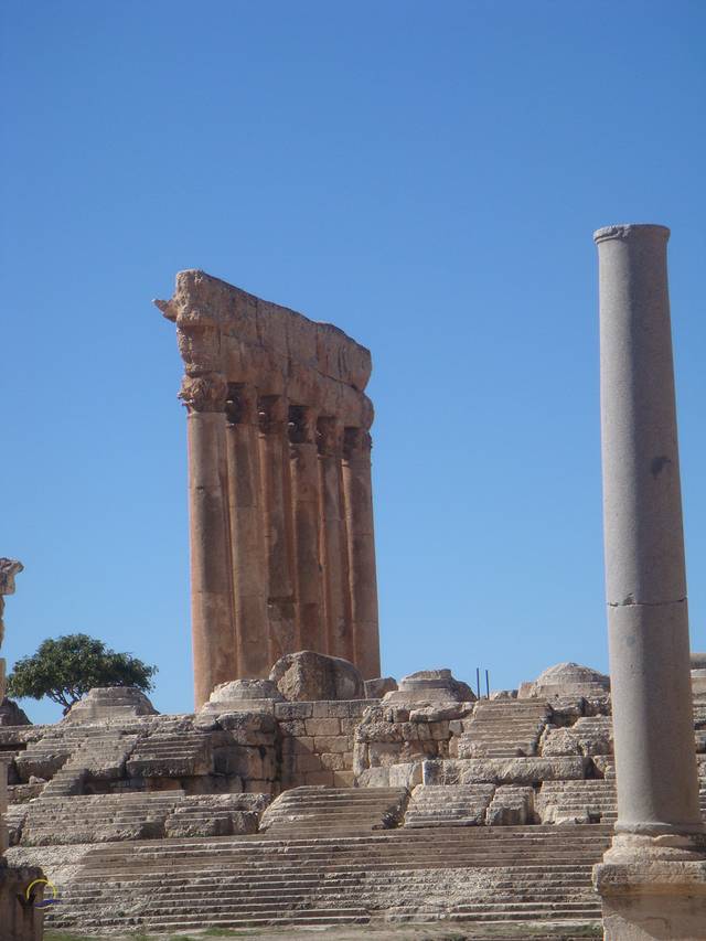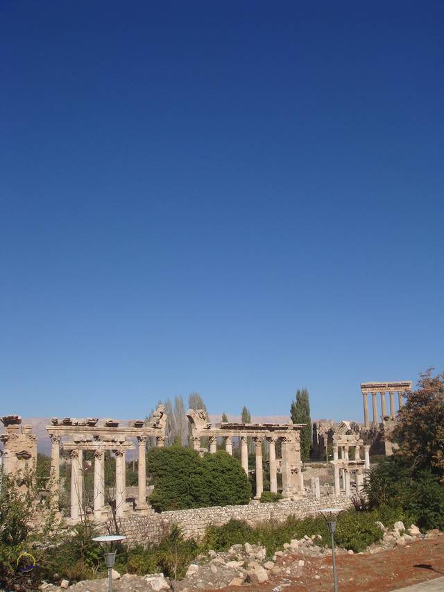 一路上风景迷人,特别是贝鲁特旁边的一个山间小镇,秋日金黄的落叶布满小道,眺望贝鲁特的海岸线有种世外桃源的感觉。翻过山,一路上我们只被要求检查一次,士兵看了看护照就行了,对于游客查的不严,反倒是盘问了车上持阿拉伯语证件的乘客几句。经过Zahle,大部分乘客都下车了,巴士行驶在贝卡谷地,两面都是连绵的山脉,山谷里空气清新,巴士人不多,经常有人在路边招手停车,根据距离不同车费也不一样。一路上完全没有昏昏欲睡的感觉,看到前方出现六根柱子的时候,司机告诉我们该下车了。
