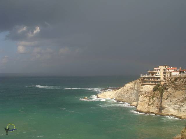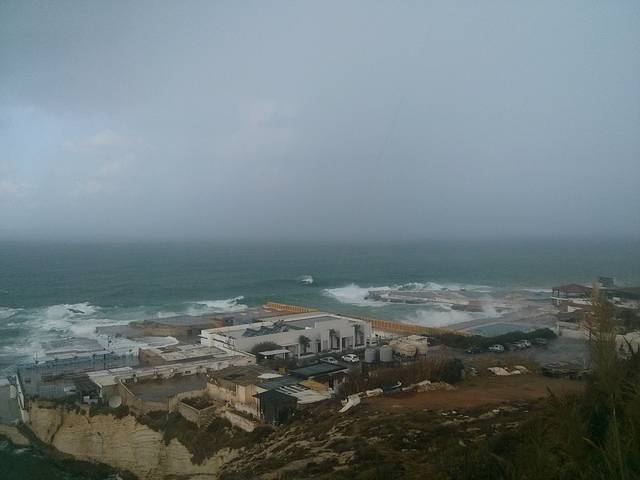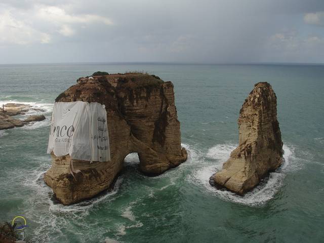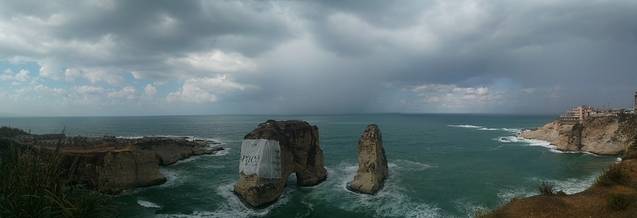 鸽子岩就是两块大石头,当时还挂了一块标语,不知道写的什么。据说岩石上有很多鸽子,但我们一只都没有看到啊,只好用“老婆饼也不送老婆啊”来安慰自己。注意后面海面上正在下大雨(在贝鲁特海面上经常可以看到这样景色,之后看到这样的云飘来第一反应是赶快躲雨)。那一天我们离开鸽子岩去美国大学时正好遇见了这片云,瓢泼大雨让我们成了落汤鸡。