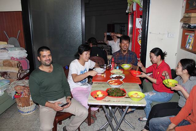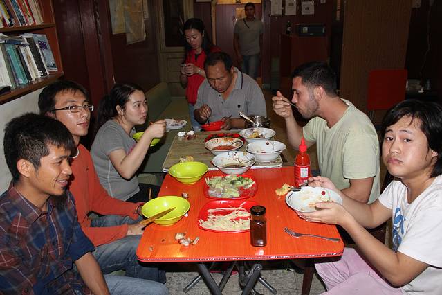 这是大家一起做饭,然后请酒店背包客一起吃饭。下午一起去超市采购,回来开始洗菜切菜,做的都是家常便饭,但是老外很喜欢吃,中华美食博大精深啊,你看,大家吃得多开心。