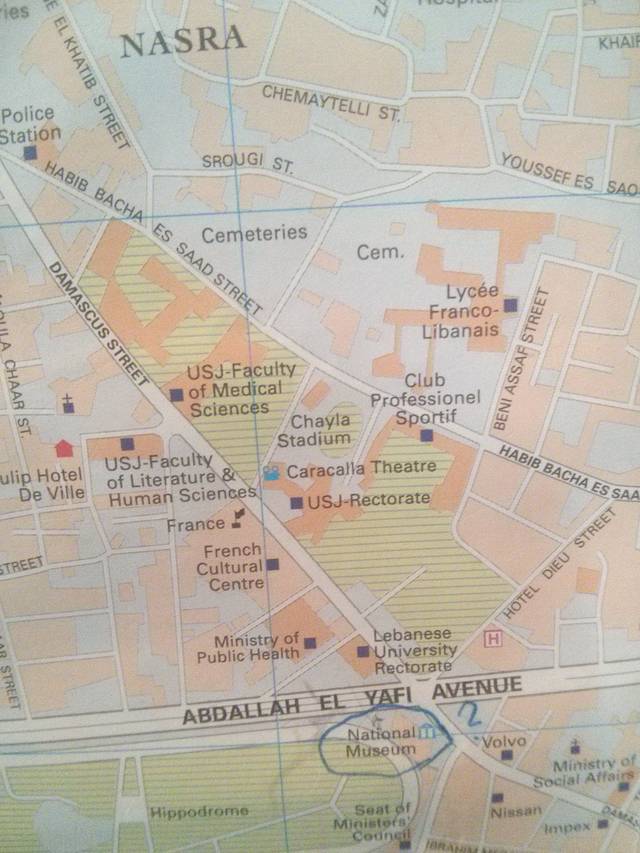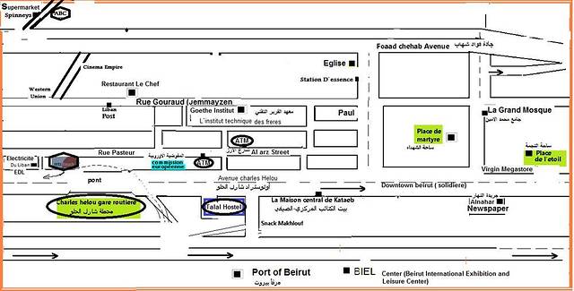 在机场告诉司机到Charles Helou,他们就知道了,小巴会过一个地下通道,这时你就可以告诉司机停车,在A或B处下车,上坡左转,走一点就可以看到Talal了,酒店没有标识,老板说因为很有名所以不需要。在一个小巷子里,上二楼就是了。