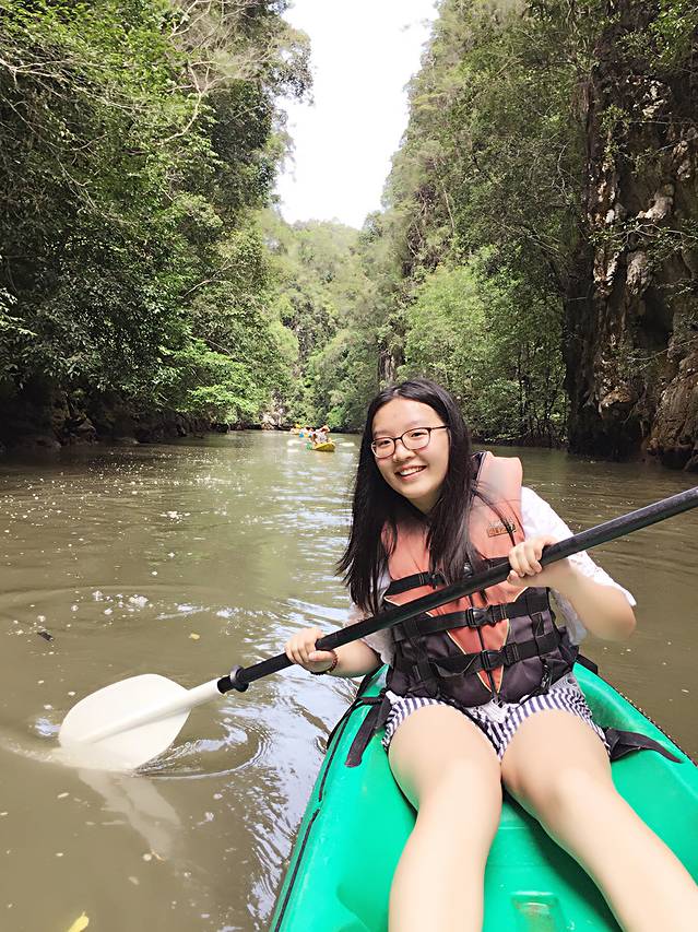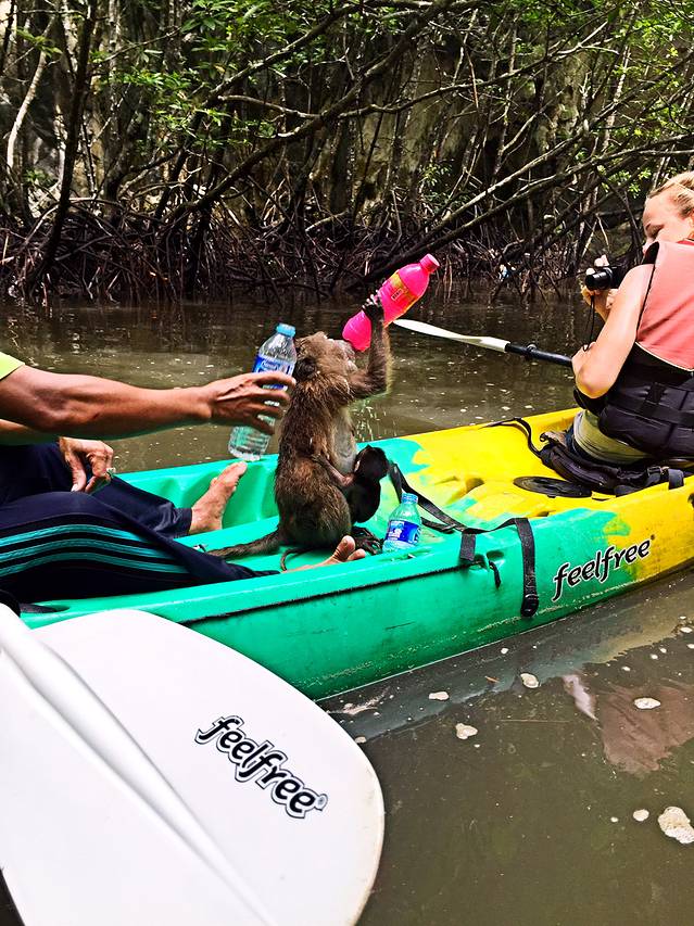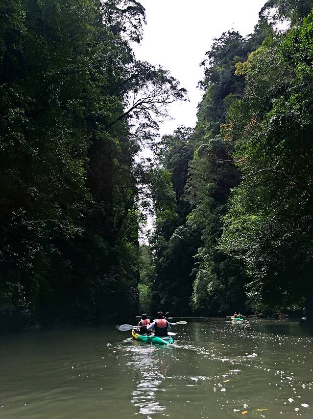 前一天晚上逛街的时候看到很多报一日游的小店,本来是想报四岛游,但是天气预报一直说第二天有雨,我们怕风浪太大根本不敢出海,老板推荐我们去划皮划艇,我们也是没有想太多就报了半日游的团。第二天一早专门有人来酒店门口接我们去划船的地方,结果上了车才发现我们把划皮划艇想得太简单了。。。。。一个团的朋友里只有我和Kelly两个都是女孩子,其他人都是男女搭配,而且大家装备都非常齐全,有两个韩国的朋友还带了手持的防水摄像机。我们在坐车去河边的路上还一直在下雨,没想到到了之后居然雨过天晴出了太阳,我俩出门的时候甚至连防晒霜都没涂,结果被晒个正着。导游在下水前向我们简单教授了握浆和划船的姿势就让我们穿好救生衣下水了,感觉我们也是非常的胆大,第一次划船的经历就这么开始了。说是河,其实就是海边丛山之间的红树林,我们一边划船一边看风景,途中有猴子跳上船来要吃的,不过我们都没有带香蕉,甚至还看到了两条小鳄鱼,简直吓得半死!我们团里的朋友们战斗力都太强,我和Kelly一直处于最后一名,划到后面船很难通过的地方甚至连人影都看不见了。虽然很累很累,但是对于我们来说都是很美好的一次经历,如果你们时间足够,一定也要尝试一下,真的很好玩~