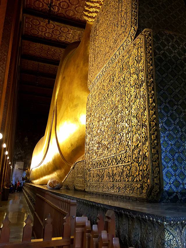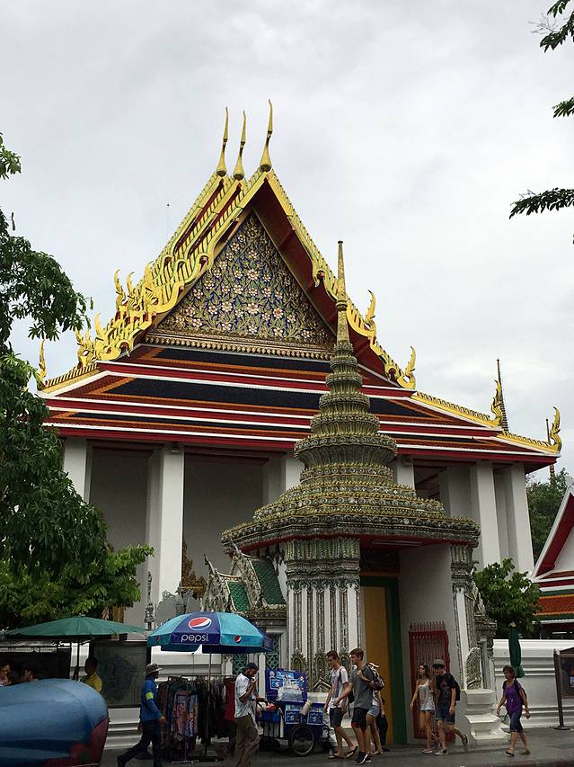 本来下午准备去宏伟的大皇宫参观,但当天恰逢庆祝日,大皇宫早早就关闭了,我们只好去了大皇宫附近的卧佛寺。大皇宫卧佛寺附近没有轻轨和地铁到达,白天曼谷交通又比较拥堵,我们只好坐公共交通到湄南河边,坐轮渡前去。从暹罗广场乘坐2站BTS后在Silom站换乘MRT到终点站Hua lamphong站,出站后顺路往河边走大概半个小时(本来我们是准备突突车过去,但是一出站就有几个人围上来过分热情,又怕他们漫天要价,我和Kelly只好打开手机地图凭感觉走去码头。。。),我们从N4码头坐船到N7码头(码头门口有票价表,到N7码头坐没有旗子的船),一人20฿,走出码头就可以看到卧佛寺啦。卧佛寺没有什么好说的咯,就是一尊巨大的卧佛(金的!)。。非常宏伟,我们大概还没有佛的一个脚指头大吧。如果穿了无袖和短裤,需要在入口处穿上绿色的长袍。。。