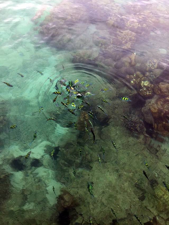 乡村海滩度假村专门有向客人提供浮潜服务,就在酒店前台右边的一个大厅里,我们本来准备去泳池游泳,顺路去问一下价格,没想到正好下午人少,1000฿就可以两个人包一条长尾船去浮潜一小时,没想到更好的运气还在后面,带我们去浮潜的船主逸普(翻译过来大概是这样读)特别好,看我们玩的开心居然带我们去了第二个海湾继续玩,后来自己也下水带我们去看了更漂亮的鱼和会吃小鱼的珊瑚,最后我们玩了两个小时还没有加钱,五点半回到度假村的时候已经退潮了,逸普就把我们放在海滩上让我们自己走回去,后来我们快回到岸上时想到忘记拿东西,又返回船上,顺便给了50฿的小费。其实50฿真的很少很少,但是我们仍然能够感受到逸普的高兴,很多时候人与人之间的善意的表达并不是金钱的多少可以衡量的,这更多的是我们对他今天工作的一种肯定和谢意,真的很谢谢这位朋友,他就是附近村子的村民,还邀请我们晚上去他的bar吃晚饭,但是忘记留电话而且度假村旁边的小店太多,我们找了很久都没能找到他,很是遗憾。