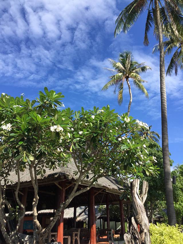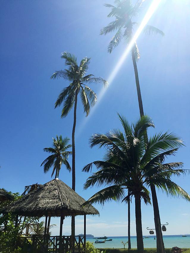 我们只享受了美妙的乡村海滩度假村一晚,第二天早上就要退房去通赛湾的另一家酒店,真的是不舍得,尤其一大早我就被透过厚重窗帘的阳光叫醒,看到湛蓝的天空和碧蓝的海水,沙滩旁高大的椰子树,真的是太开心,在海边的这三天一直下雨,今天终于见到阳光,风景实在是美好到让人无法移开目光。早上在海边享受完早餐,我们收拾好行李后就等待船过来接我们去通赛湾。