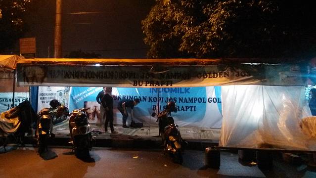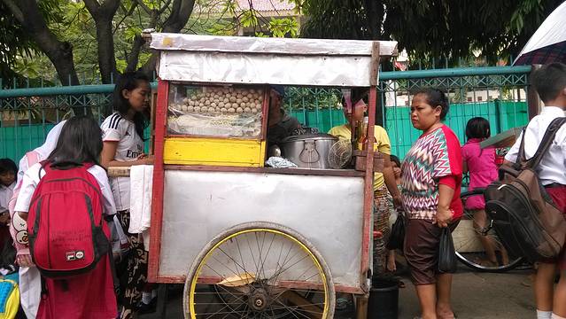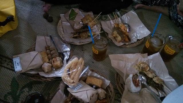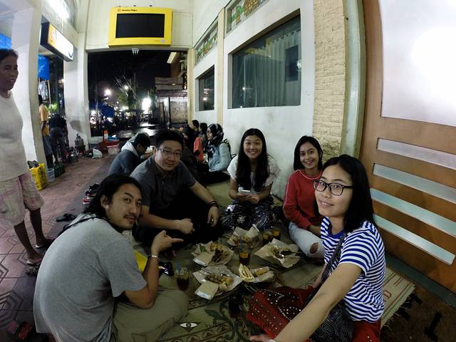 在水宫躲雨的时候,碰到的小伙伴约了晚上一起吃饭,发的地方可是找苦了我们。后来才知道,这种当地最有名的餐馆,没有餐位,人们挑选好想吃的东西,席地围坐在一起,小伙伴推荐的这家是在开在一家报社前边,名字就是以报社命名的。这样的餐馆集中在主大街铁道以北,整条街上都是这样的餐馆,印尼人经常是一家人围坐在一起,有说有笑的一起吃饭。