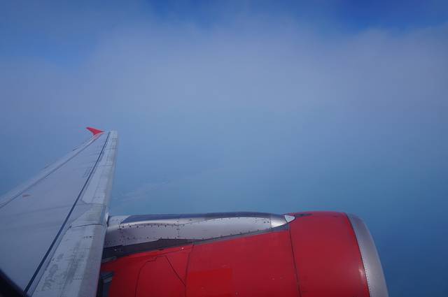 在飞机上无聊,拍照解闷儿,亚航标志性的红色机翼。在云端,天蒙蒙亮。