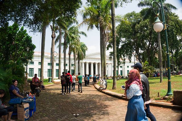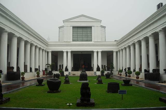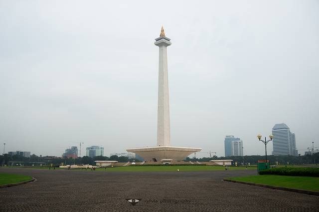 国家博物馆离独立广场很近,步行10分钟就能到。独立广场跟天安门一样,是雅加达的心脏,所有雅加达的国家行政部门都围绕着广场四散在广场的各个方位——广场北为总统府,东北方有印尼最大的伊斯蒂赫尔大清真寺;西街上有国防部大院和中央博物馆;东边是火车站;国家的阅兵等重大活动也都是在此地举行。广场中心的民族独立纪念碑,是印尼第一任总统下令修建的,碑顶上35公斤金灿灿的火炬,远处看格外耀眼。还可以买票等上纪念碑顶,俯瞰雅加达全景。