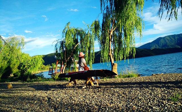 门前就是泸沽湖,湖湾有许多长椅。当夜幕降临,三五好友,一壶浊酒,乘着湖畔飘来的清风,快意人生。。。。
