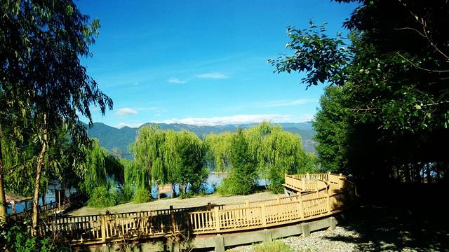 就是在这里,达祖,因为我们是三人行,他们带我们去看的房间也不怎么满意,就现场在网上找的三人间,在小草海赵家湾,有一点远,师傅载我们过去的,还是给了30元车费。不过,达祖的风景真是倍儿棒,靠近湖边,杨柳依依,碧波荡漾。。。。。
