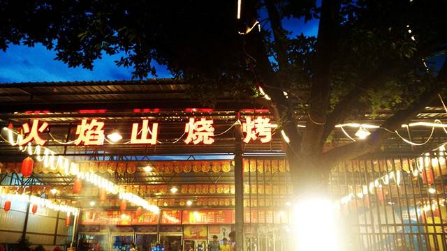 最终我们选择了这一家,火焰山烧烤,店很大,里面并排着很多桌子,很有大排档的感觉。大热天的,客人们光着膀子,喝着冰镇啤酒,热热闹闹的,很有气氛。