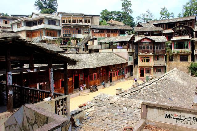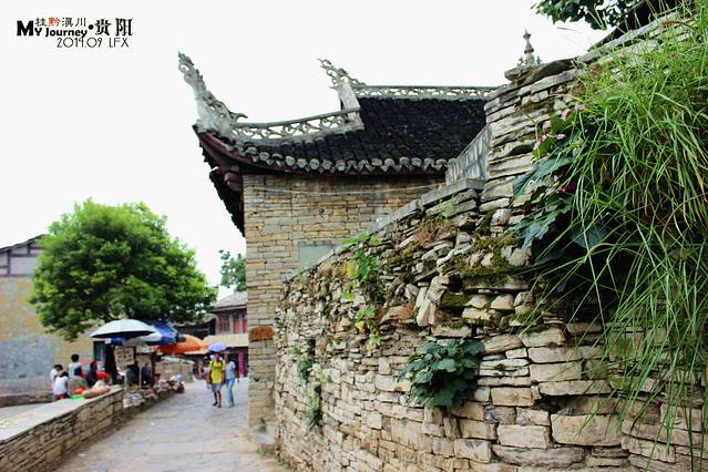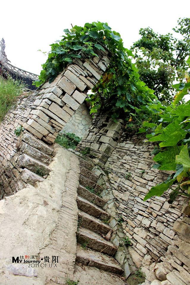 镇山村离天河潭不远,是一个很安静的古村。以布依族文化为主题,村寨像个古堡,城墙依山而建,是用大块规整的石头筑成,城门则是用条石拱建而成,像房屋的墙壁和院坝是用小块石板垒砌,而屋顶是用不规则的石板代替了青瓦,脚下的路面和小巷的台阶全部用大块的石板铺就。