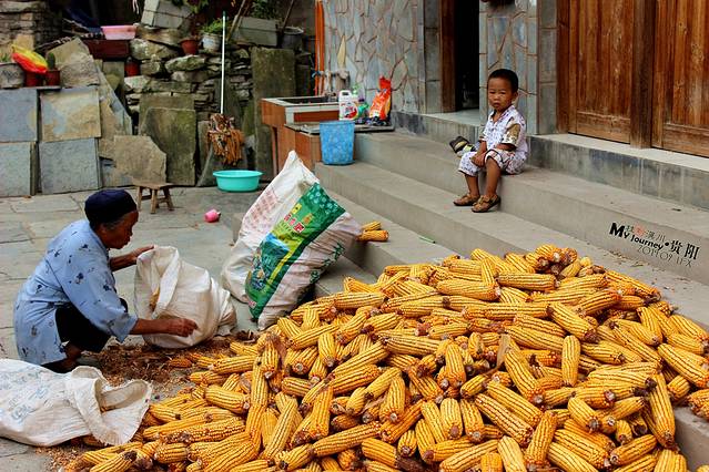 天快要下雨了,奶奶把晒干的玉米收回,孙子在一旁观望。农场里最常见的场景,但我也多年未见了。