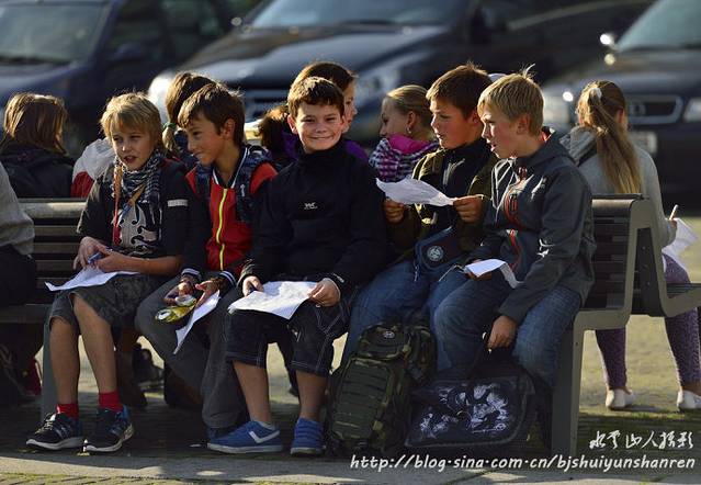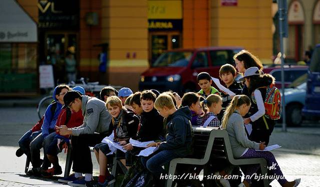 广场上看到老师带领下的一群学生。本地人和游人看上去大都很悠闲