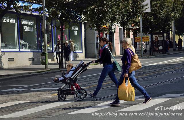 逛马萨里克大街。街上有轨电车来来往往。
