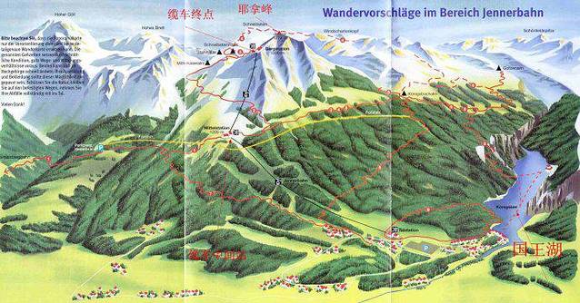 网上有网友博客曰:游国王湖有两种方法,一种是乘缆车登上它旁边的耶拿峰(Jennerbahn),从上面俯瞰国王湖;另一种是乘船在湖上游览。我们玩的是第一种,应该前一天不在慕尼黑住,直接来国王湖,那样就能两种方法都玩了。
