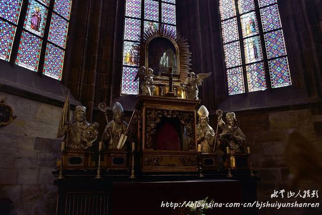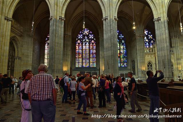 7:30早餐,9:00从卡罗维瓦利出发驱车前往捷克首都布拉格。12点到达布拉格,在台湾餐馆午餐后由布拉格地导王燕(长春人,讲解使用相声、评书等腔调,风趣幽默)迎接,乘车到到布拉格城堡。首先参观金碧辉煌的布拉格宫(总统府),并入内参观始建于1344年的著名圣维特教堂(St. Vitus Cathedral,通票),圣维特大教堂是布拉格城堡最重要的地标,除了丰富的建筑特色外,也是布拉格城堡王室加冕与辞世后长眠之所。游人至此仿佛时光倒转至中世纪,抬头所及皆是历史悠久的教堂和建筑,聆听着悠扬的乐声,有如一套完整的文学、艺术、音乐和建筑之旅。教堂内极其富丽堂皇,既庄严肃穆,又神秘神圣;可以带三脚架拍照,请见笔者专文《教堂内的壮丽》。圣维塔大教堂后方有双塔的红色教堂就是圣乔治教堂(St.George's Basilica),圣乔治教堂是捷克保存最好的仿罗马式建筑。