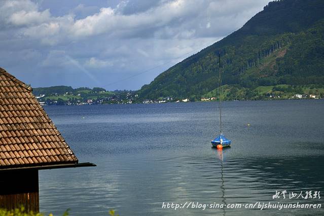 当时多云间晴,有时有不很强的阳光照射到湖中教堂上,分外醒目。
