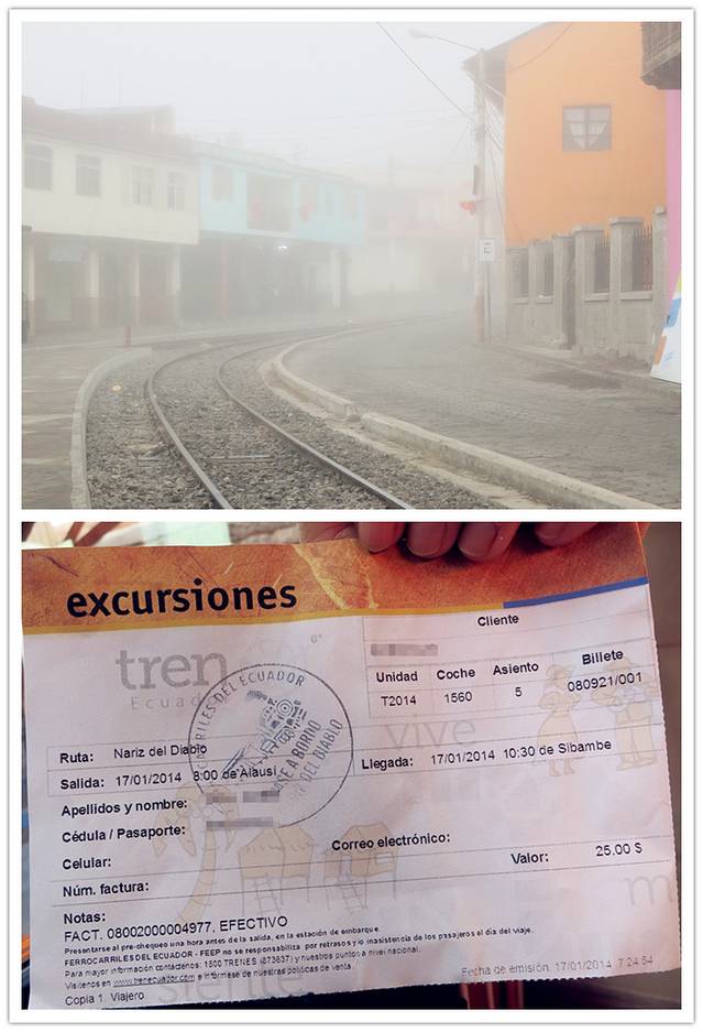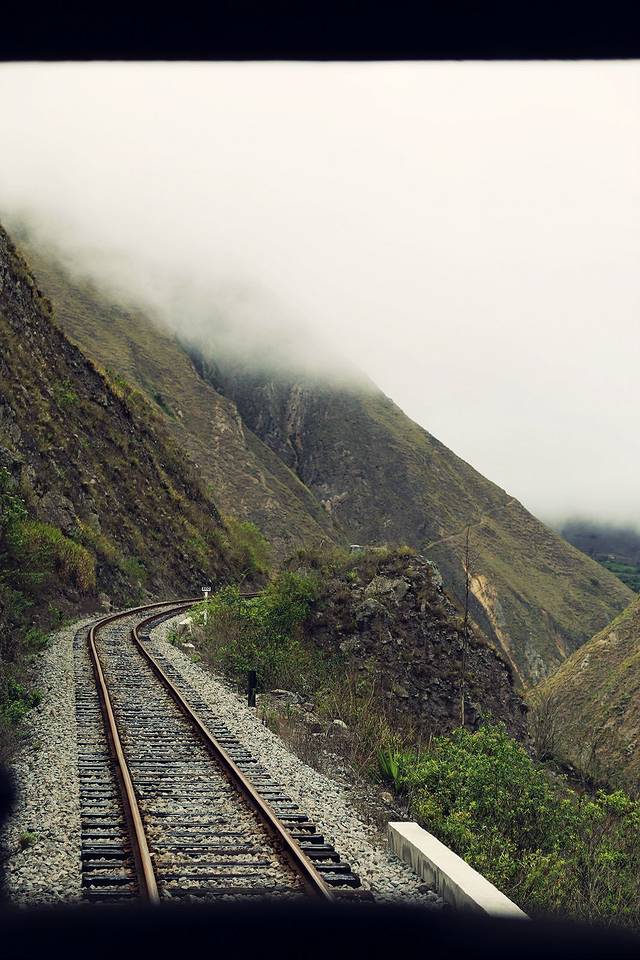 最早一班火车八点出发,我七点不到就在车站与Maria一家会合,车站还没开门,门前已排了近十个人的队,都是在碰运气看有没可能买到车票,多亏了Maria,帮我拿到倒数第二张票… 这是第二次在厄瓜多尔搭火车,与Ibarra的自由号不同,这列由Alausi往返Sibambi的 Nariz del Diablo(Devil's Nose/恶魔之鼻)因号称 “the most difficult train in the world" 而更加出名(虽然我并不认同),因此更加游客化,都是些讲西语的旅行团,于是我又成了个典型(在厄国已经被围观得习惯了)。也许是雨季的原因,自始至终那迷雾都未散去,并没有传说中的高原峡谷的震撼感,但也别有惊喜,因为是第一次在云雾中如此穿行呢。