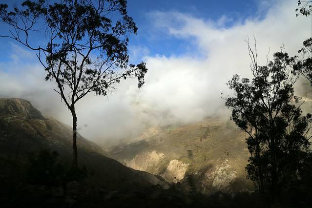 由Latacunga至Alauai,走的是E35号公路,据说亦是美洲泛美公路在厄国的一段。上下两张照片是在前后不超过20分钟的时段里拍的。。。我称后者为迷雾,而越临近Alausi,迷雾就越浓,似雨非雨似云非云,能见度极低,但巴士司机依然勇猛无比,看得我心惊。