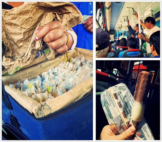 在厄瓜多尔,无论短途巴士或长途车上,都会有一些小商贩上车兜售食物等等… $1/两根巧克力冰棍儿降降火~