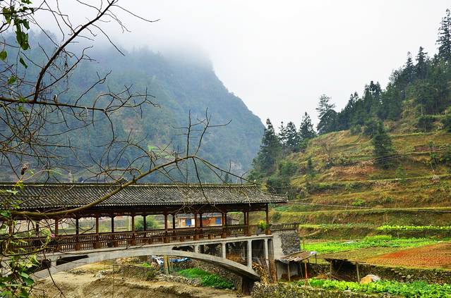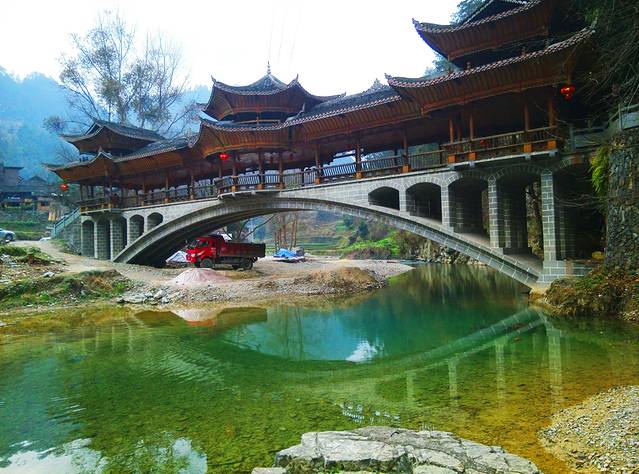 我当时是从凯里市的汽车客运站坐班车到郎德上寨的,就在上图所看到的风雨桥处下车。很方便。大概40分钟一趟的班车,每人19元,耗时大概45分钟。个人觉得挺方便。我到了风雨桥,就打电话给老板娘。