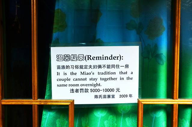 我预先在携程网上搜的客栈,个人游嘛,自己也是一个男生,所以就选了价格较便宜的一间叫【郎德全景客栈】的民宿。我曾看到过的,最有意思就是下图了,男女不能共睡一个房间。当然了,这是苗家人的习俗,游客也是一定要遵循的。支持支持!