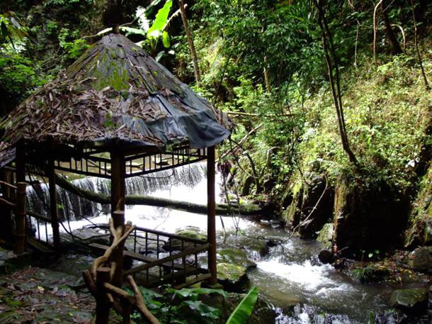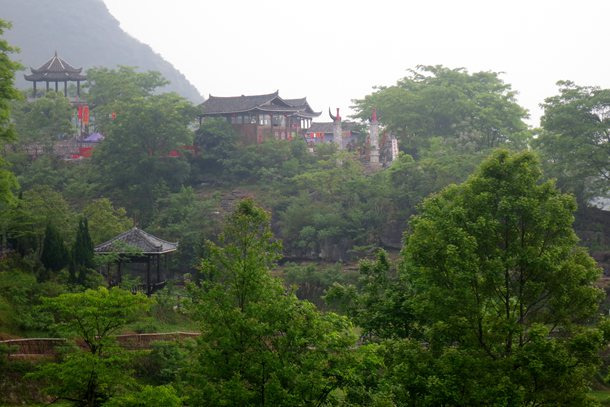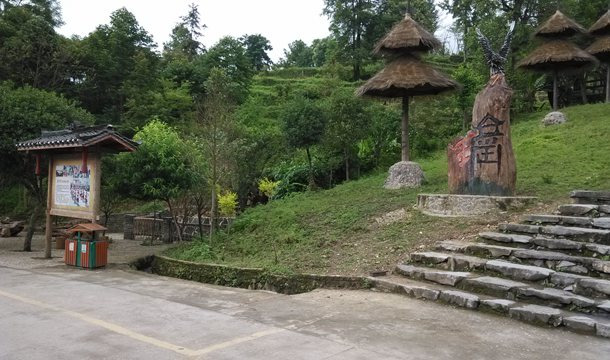 来到这里,看到上山路径和供游客观瀑的亭榭都与周围环境相协调,亭榭都用树皮做顶、竹木做梁,显得极为原始古朴,真是别有韵致。沿溪边的水泥栏杆像树枝、藤蔓,时而笔直时而弯曲,是行走在路上最为突出的美景了。