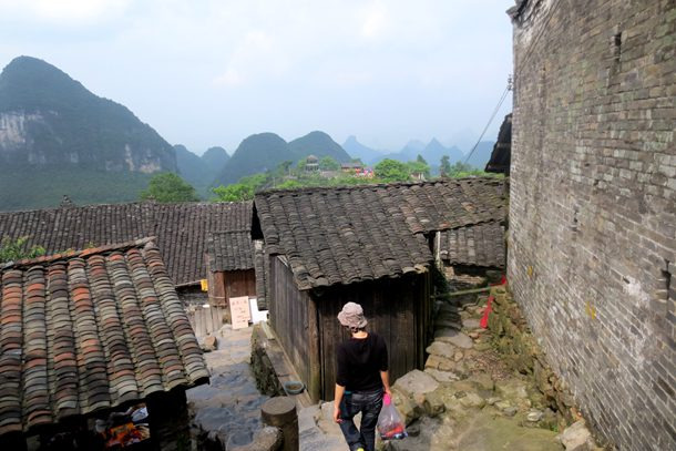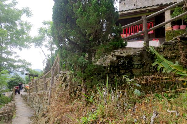 山寨里的建筑都是前面的房子的屋顶和后面房子的地面平高,中间一条走廊过道,横街直巷,就地取材,以石块铺路,把各家各户串连起来,这和城市里的建筑都了份亲切和谐的气氛,挨家挨户,走街串巷就方便多了。还有建筑房梁上挂满了瑶民们自己亲绣的小布包,比起如今机器生产的书包,瑶族的手工作品应该是上一代给予下一代的精神食粮吧!