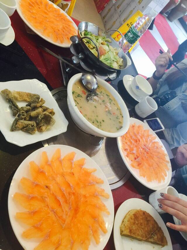 中午吃的三文鱼~一条两斤的鱼已经有三盘鱼片.鱼皮拿去炸.鱼骨熬汤…这样一顿下来才100左右.四个人吃得好饱(提前回广州的那一男一女没得吃)哈哈