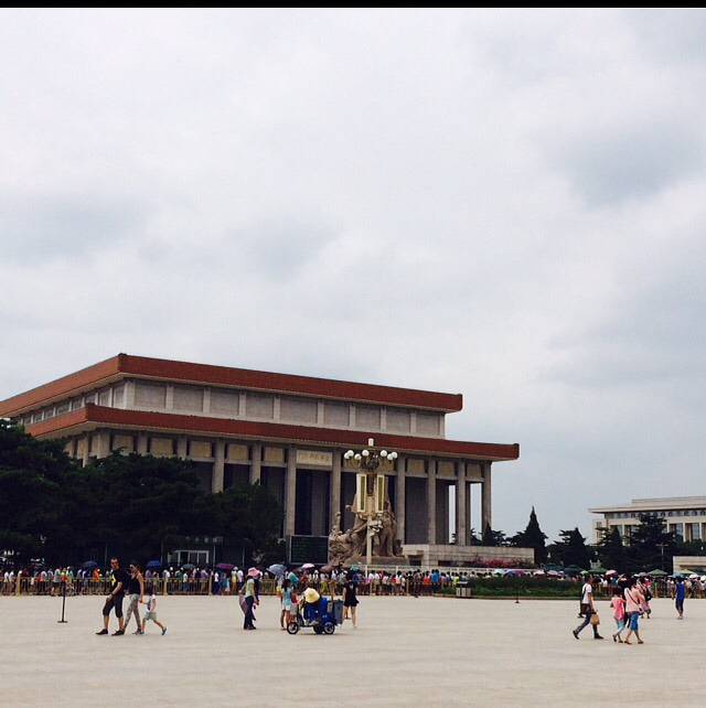 地铁2号线前门站下车,出站后即是天安门广场。来到这里,安检相对严格多了,记得出站后安检了一次还会抽查你的身份证,要进广场时又一次安检。进入广场,左侧是毛主席纪念堂、纪念碑和人民大会堂,右侧过一马路是国博。