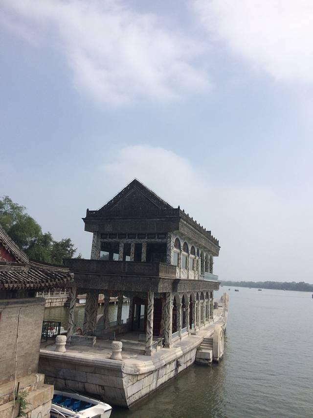 这就是石舫,也称清宴舫。远观它像一只大船,近看被它完美精巧做工所折服,穿上镶嵌五色玻璃,顶部用砖雕装饰,不失皇家气派。其实眼前之景只是在被英法联军破坏后慈禧太后重新修缮为其观景饮宴之地。即便做工再完美,船体青苔也难敌历史沧桑。